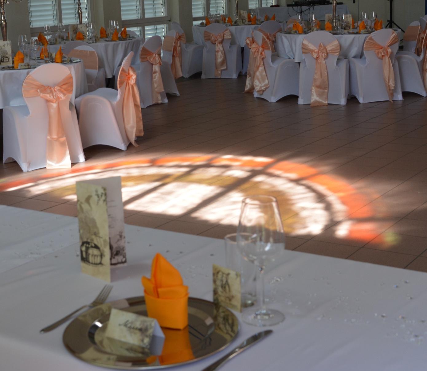Die Farben, die zu den warmen Farbtönen gehören, haben besondere Eigenschaften. Orange steht für Optimismus, Freude und Energie und lässt sich hier wunderbar anpassen zu den farbigen Glasfenster die den Saal liebevoll in warmes Licht taucht. Apricot ist eine der Trendfarben der aktuellen Hochzeitssaison.